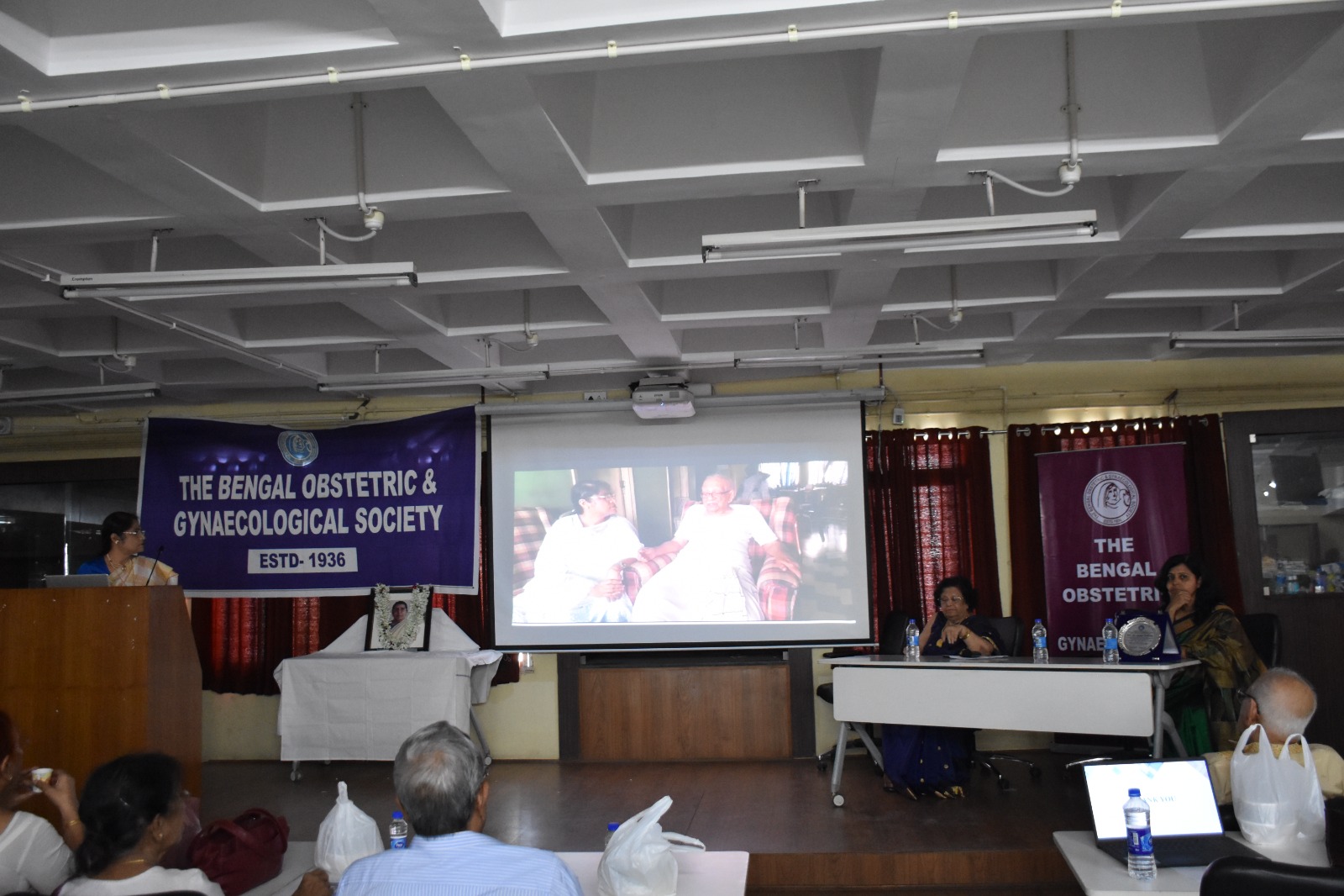 The 1st Dr Mahamaya Sarkar Memorial Oration was started with a welcome address by Dr Mousumi De Banerjee, President BOGS, where she presented a video filmed on 13.09.2023 at the residence of Dr Mahamaya Sarkar. It showed Dr Mousumi De Banerjee inviting Dr Ajit Kumar Sarkar, husband of Dr Mahamaya Sarkar, to the programme on behalf of BOGS. Dr Ajit Kumar Sarkar had taken initiative for this oration. He showered his blessings and handed over the picture of Dr Mahamaya Sarkar to team BOGS in the video.